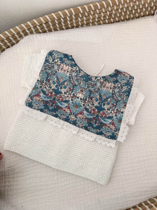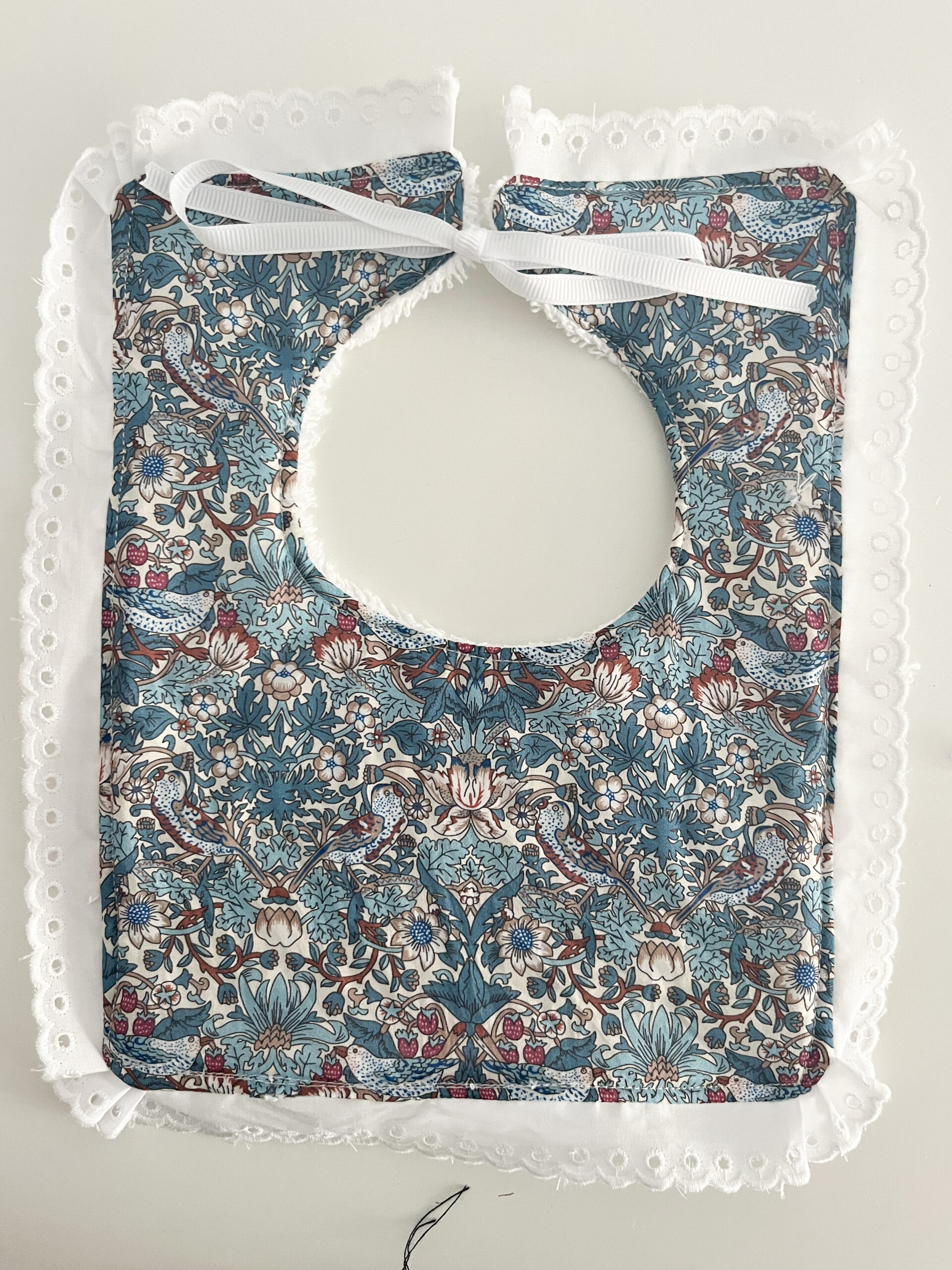 Planchar con un paño encima del babero para no dar directamente en la tira bordada y la tela o planchar por el lado contrario