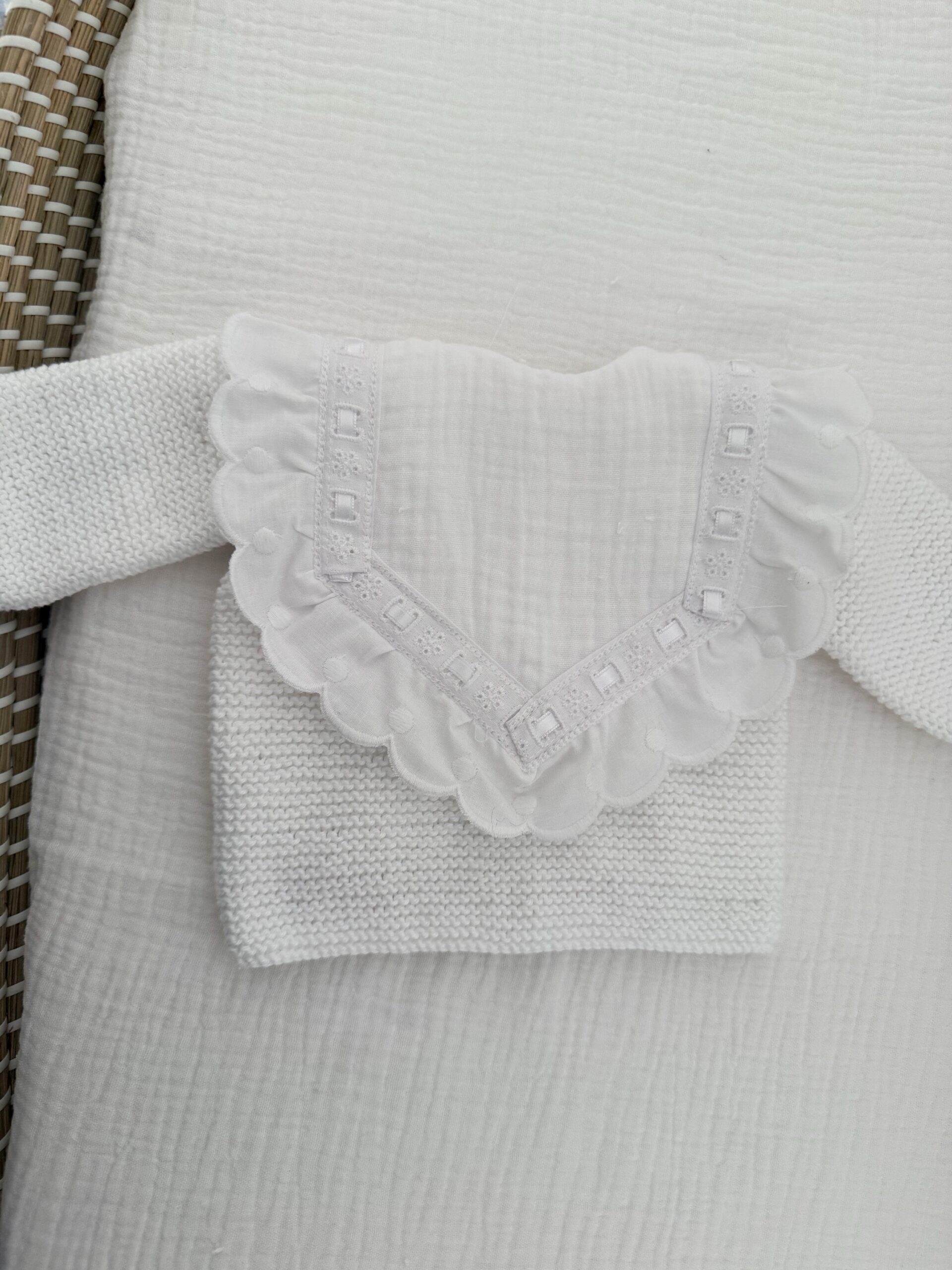 Babero de bambula y rizo en la parte trasera en algodón 100%. Color blanco combinado con una tira bordada y entredos con lazo de diferentes colores.