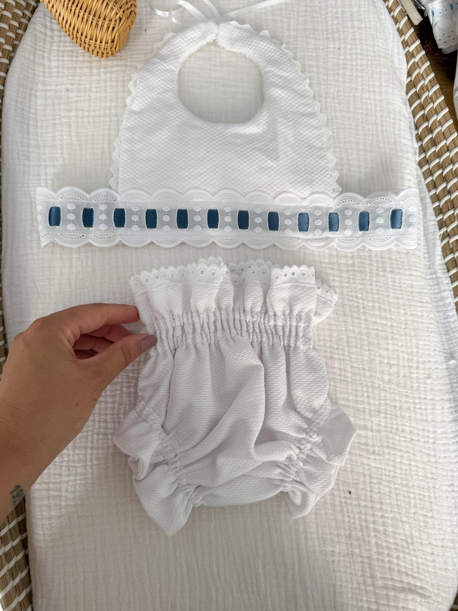 Babero de piqué y rizo en la parte trasera en algodón 100%. Color blanco combinado con una tira bordada y entredos con lazo de diferentes colores