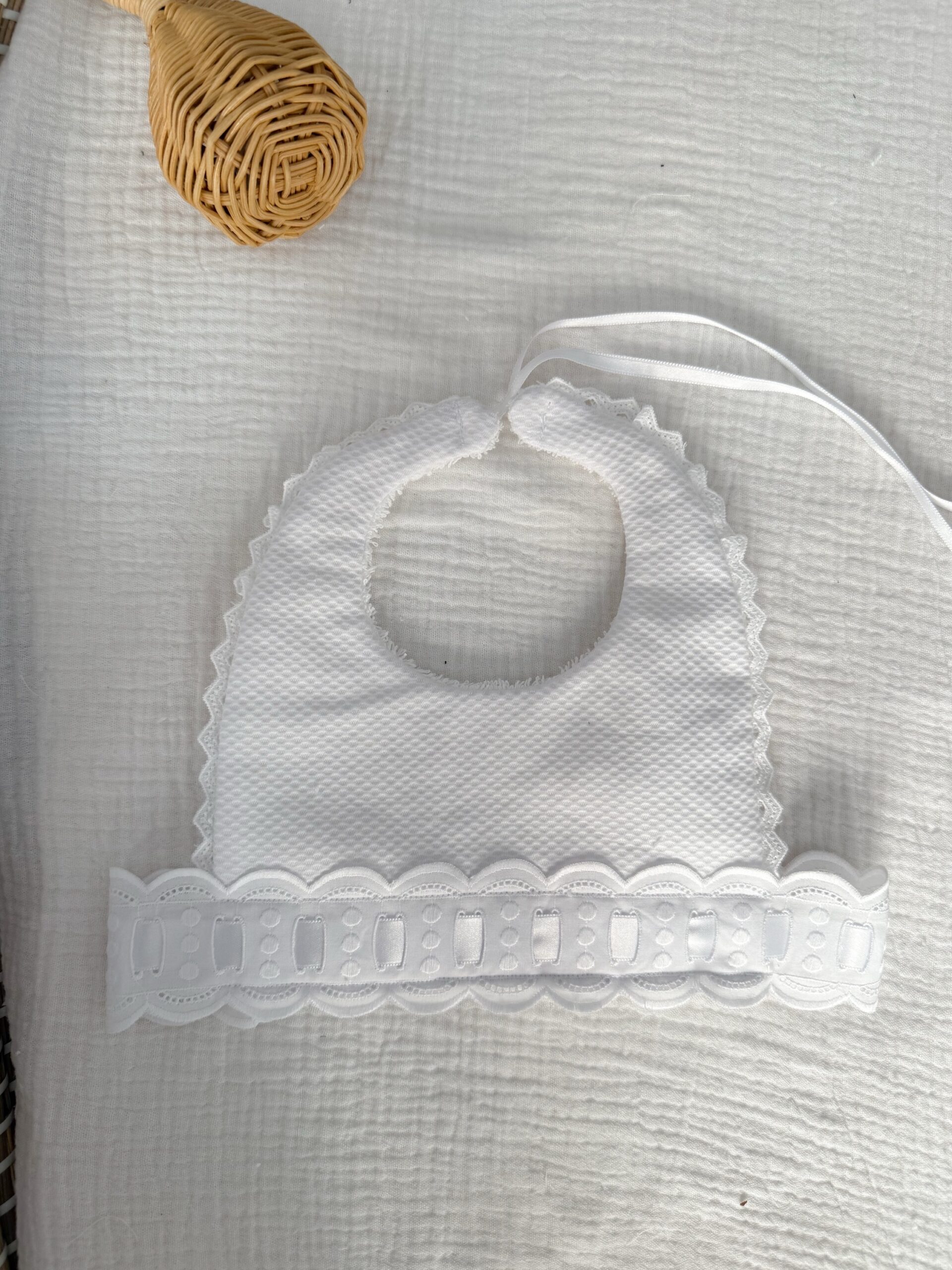 Babero de piqué y rizo en la parte trasera en algodón 100%. Color blanco combinado con una tira bordada y entredos con lazo de diferentes colores