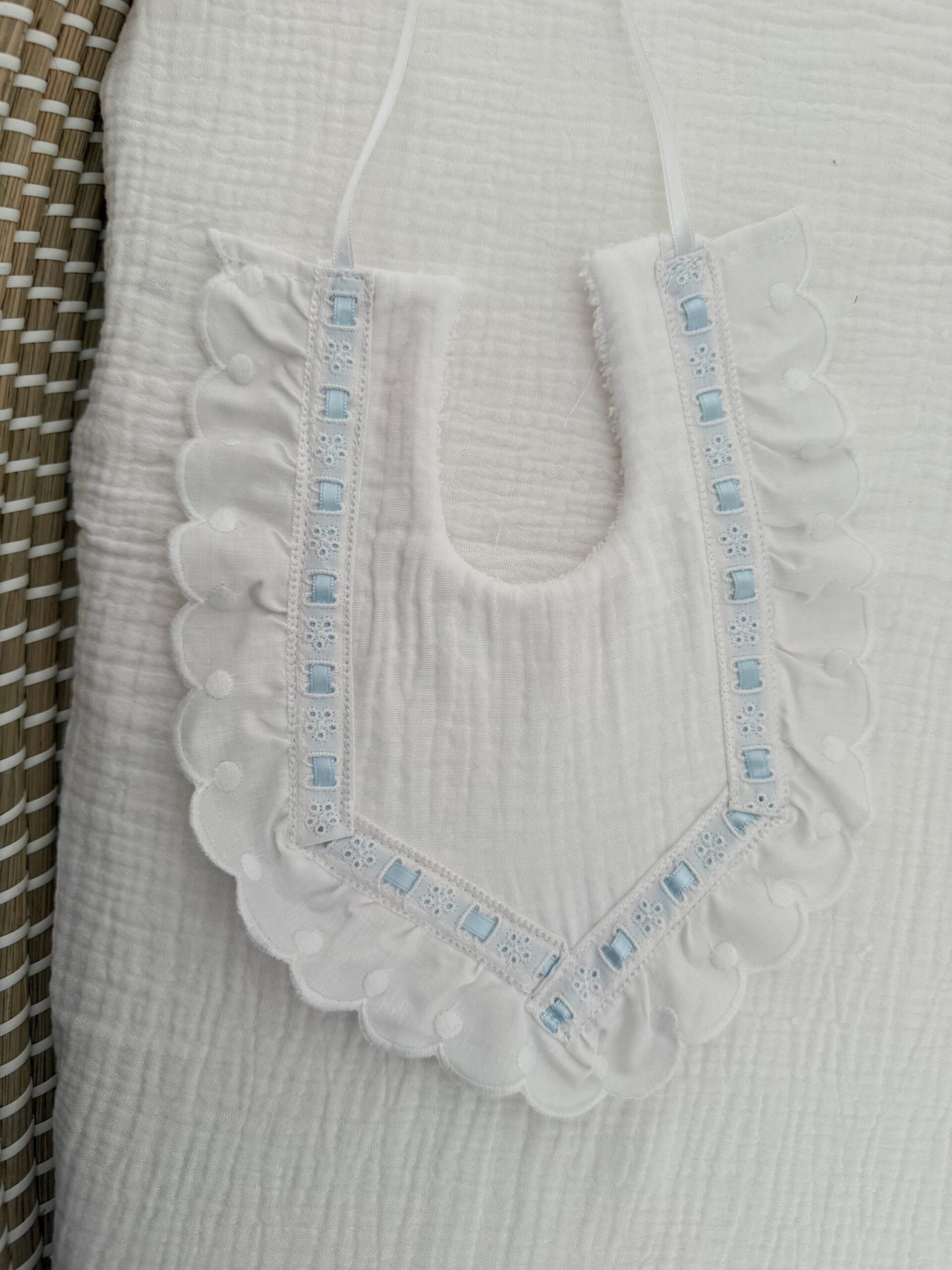 Babero de bambula y rizo en la parte trasera en algodón 100%. Color blanco combinado con una tira bordada y entredos con lazo de diferentes colores.