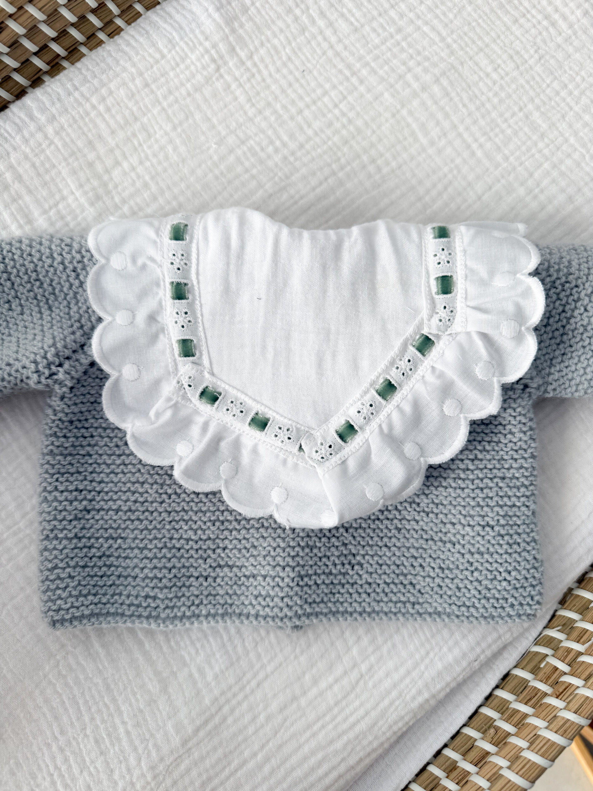 Babero de bambula y rizo en la parte trasera en algodón 100%. Color blanco combinado con una tira bordada y entredos con lazo blanco.