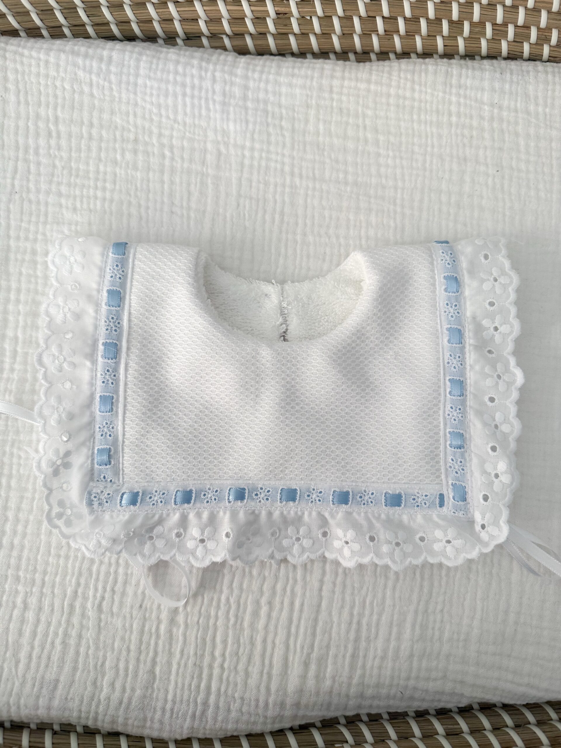 Baberola cuello de piqué con rizo en la parte posterior de muy buena calidad que evita que se moje la ropa.