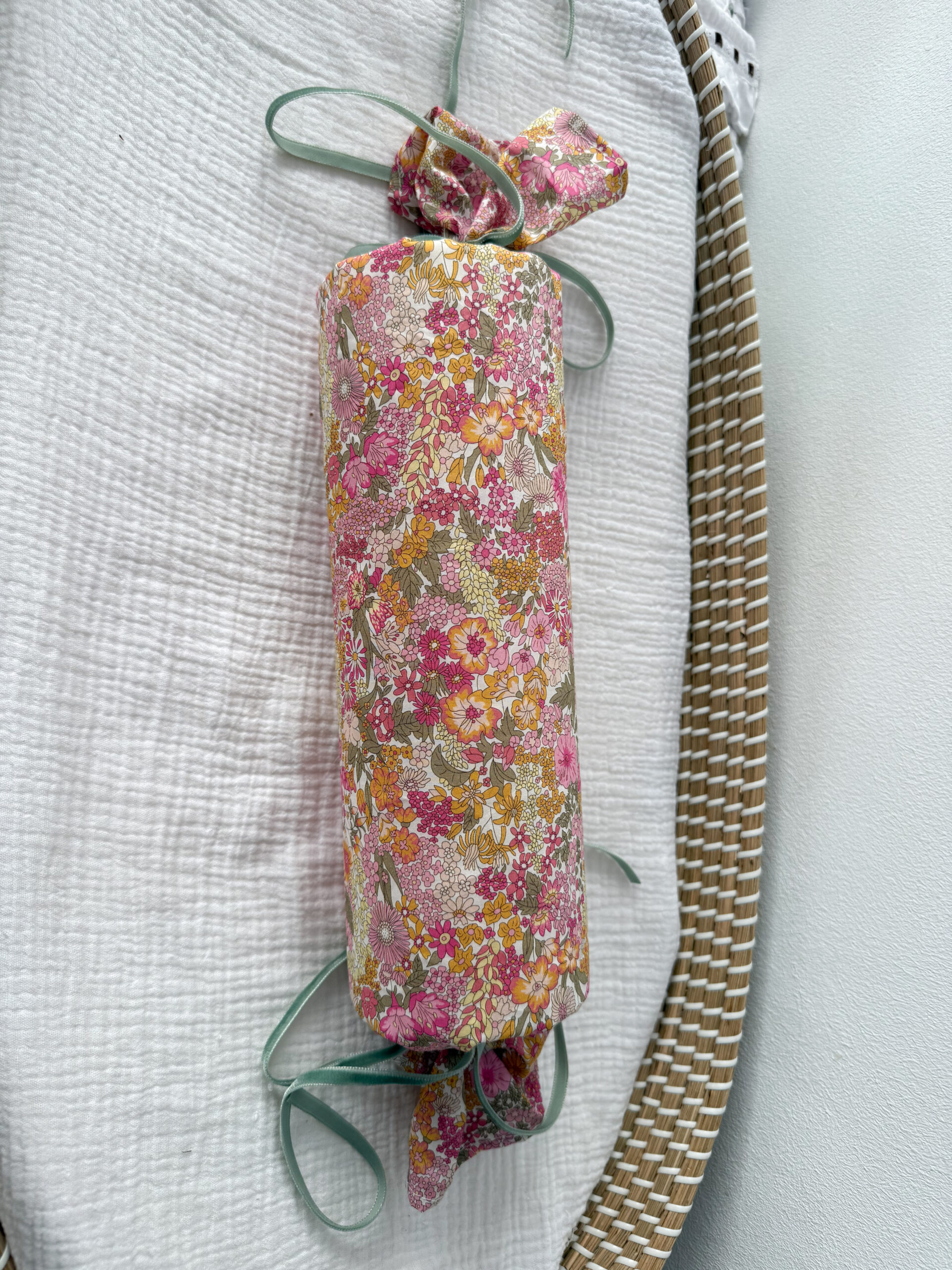 Cojin antivuelco liberty otoño con tira bordada en el extremo y lazo en terciopelo verde empolvado.