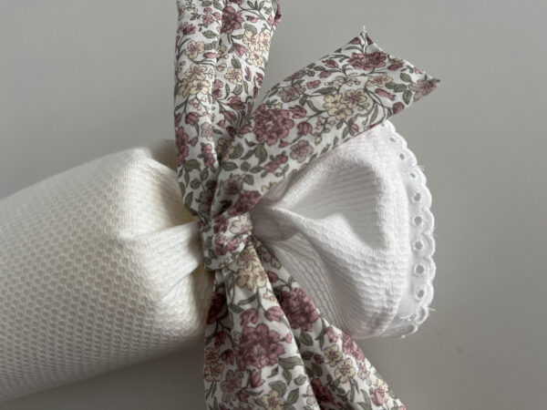 Cojin antivuelco piqué con forro por dentro, tira bordada en el extremo y lazo de flores olivia.