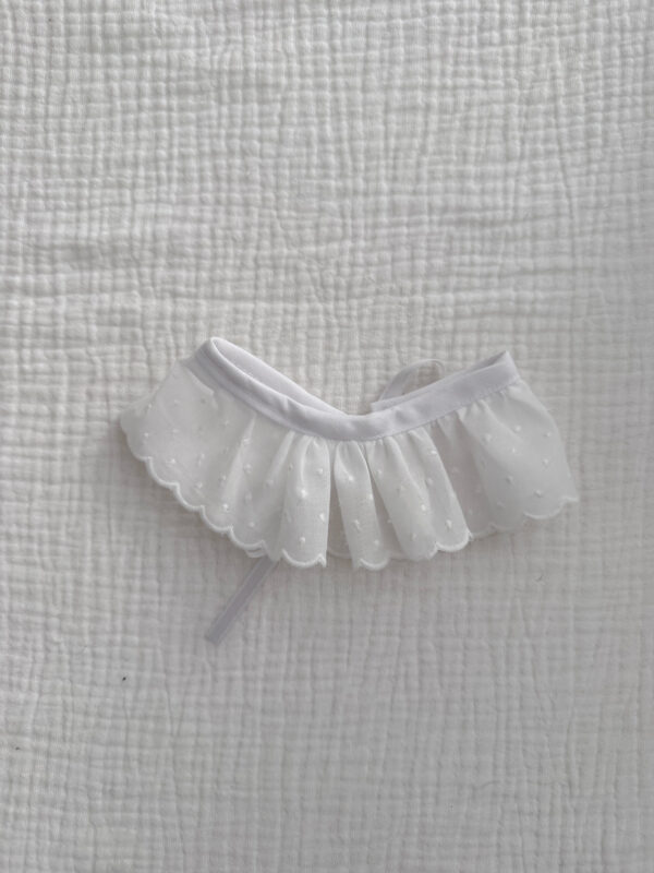 Cuello blanco hecho con tira bordada con lazo de raso para su cierre en la parte trasera y mejor ajuste. Recomendado para los más bebés de la casa 0/6 meses.