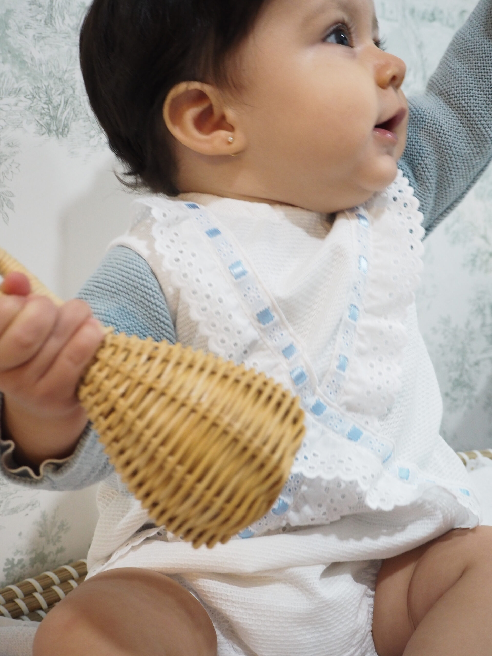 Ranita piqué con tira bordada y lazo celeste bebé. Lleva botones traseros de nacar y también en la entrepierna para facilitar el cambio de pañal.